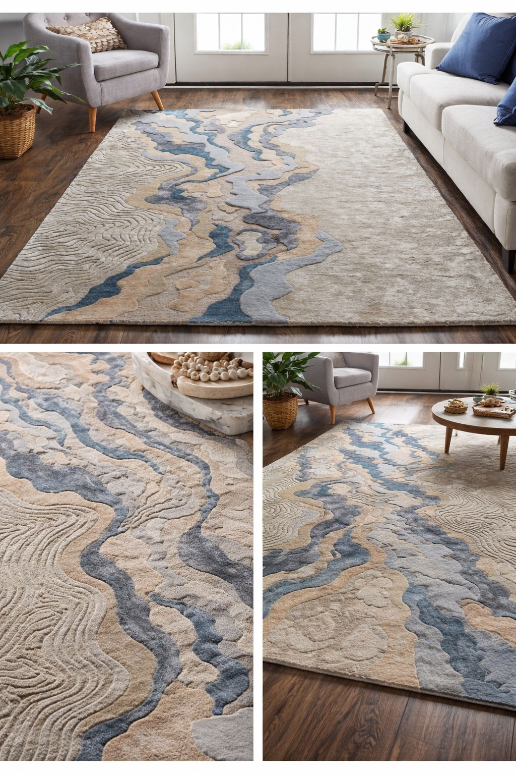“The Rivera Flow Hand-Tufted Area Rug brings a sense of calm movement and contemporary elegance to your living space. Inspired by natural river streams and layered landscapes, its sculpted pattern blends soft neutrals with soothing blue and grey tones, making it a perfect statement piece for modern and transitional interiors.
